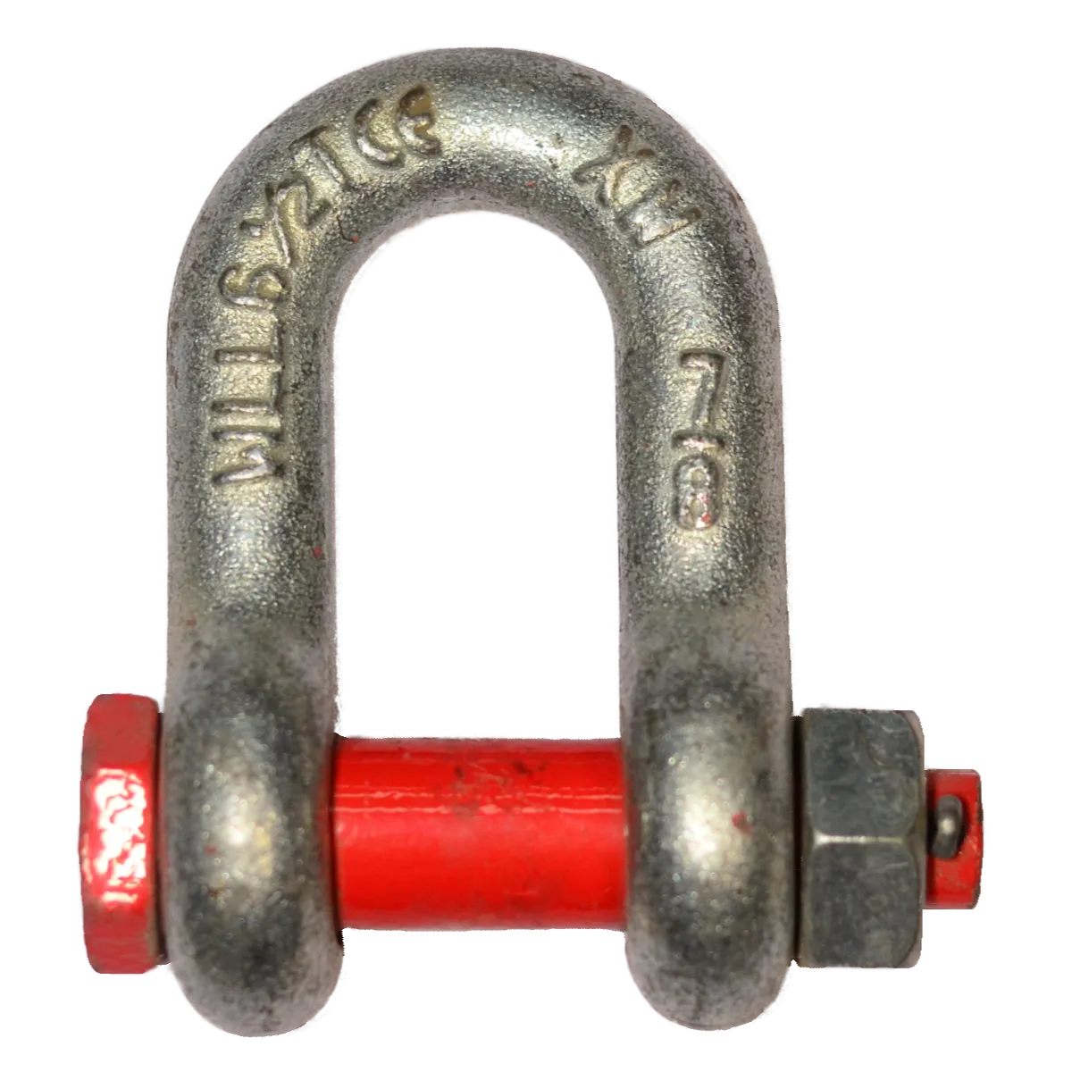 A heavy‑duty alloy steel Dee shackle with nut and bolt fastening for secure rigging connections.